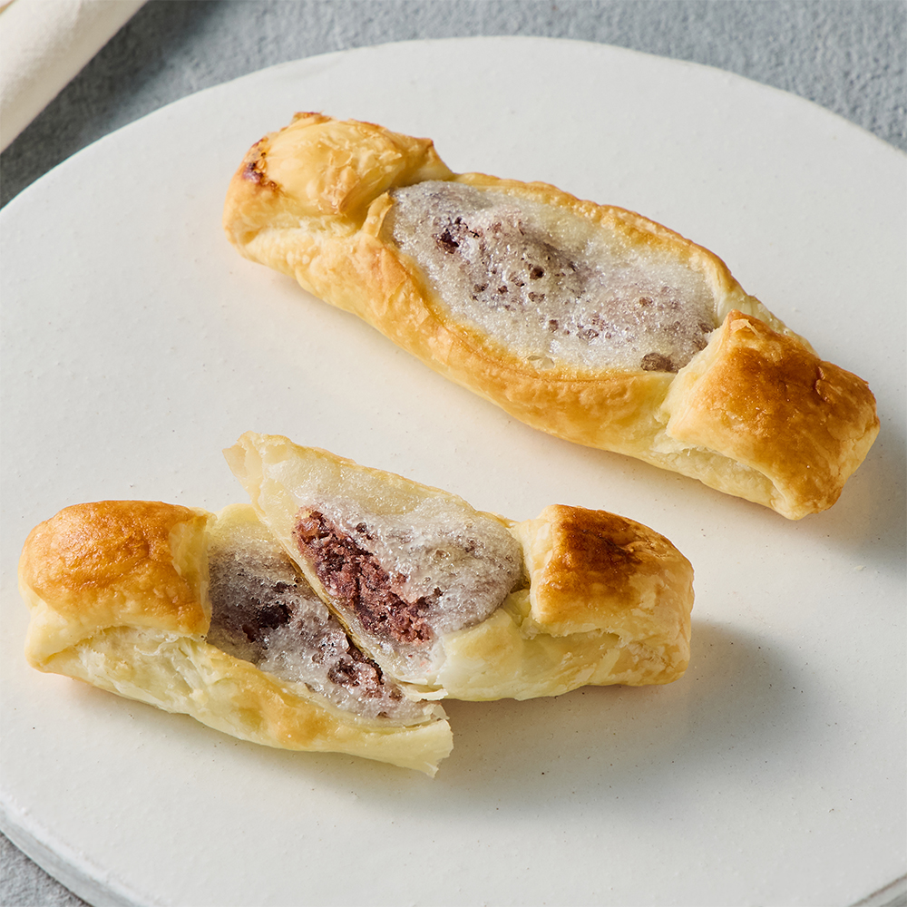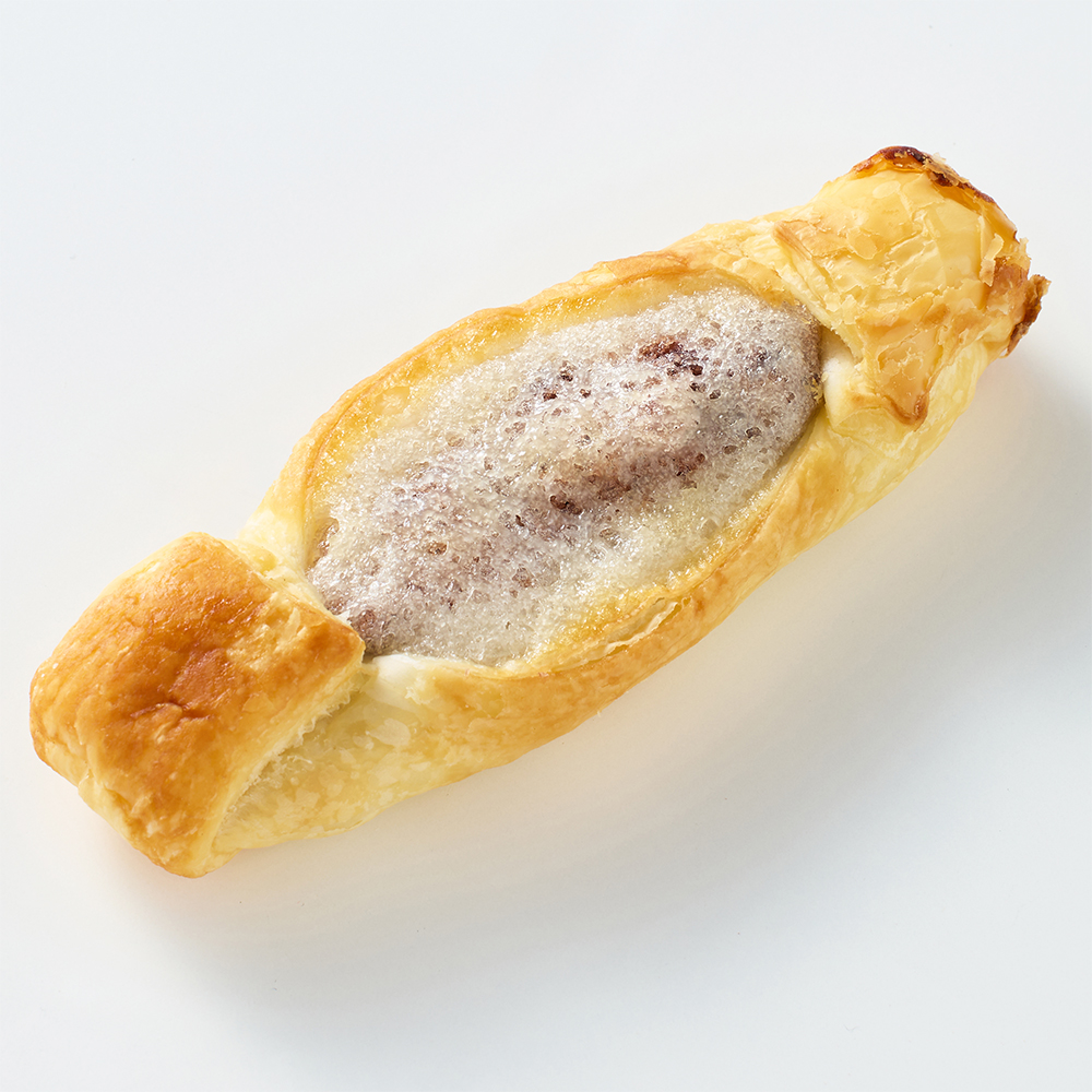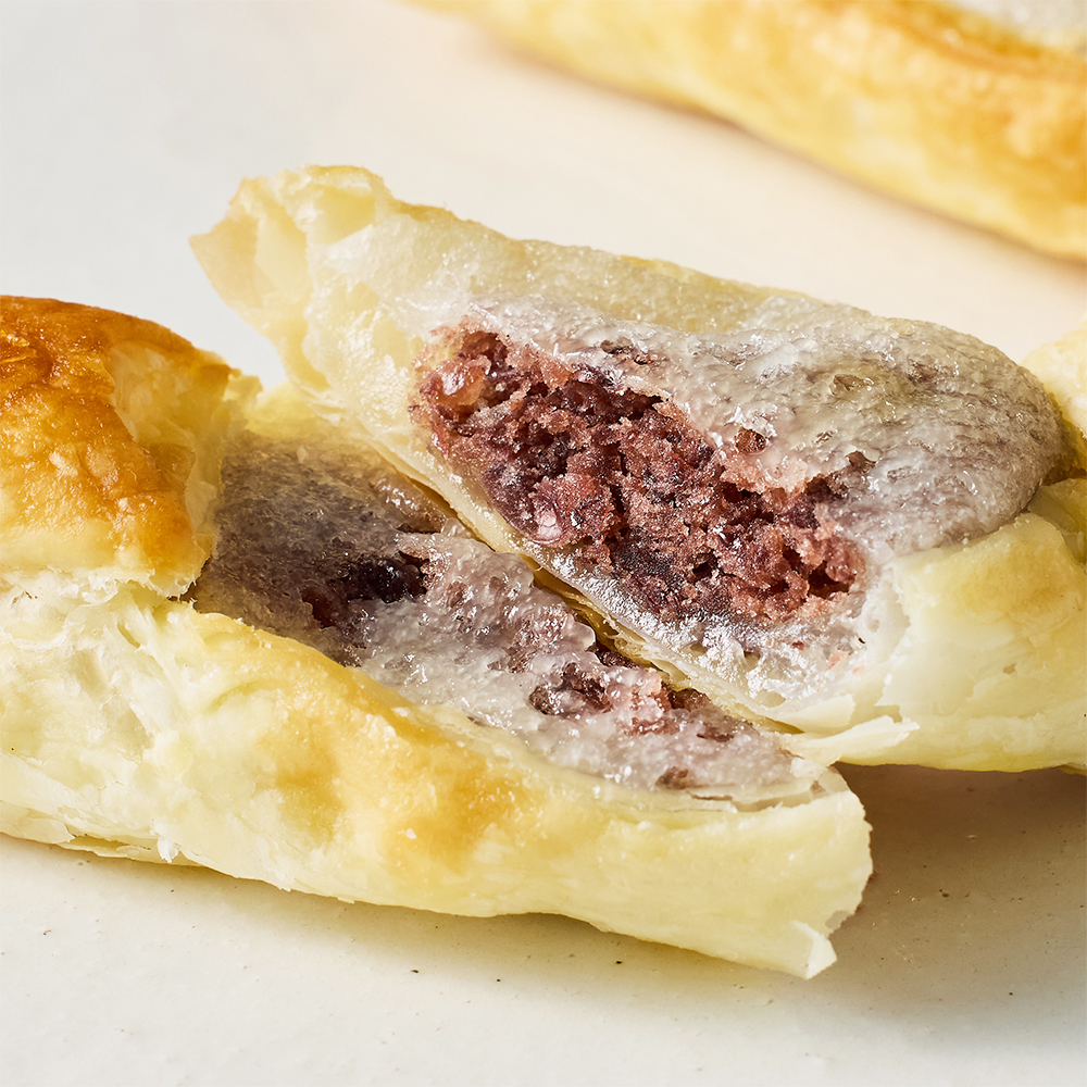 “サクっと”食感は、厳選した上質のパイ生地の食感。“モチっと”食感は、粒あんとお餅が一緒になったその名も粒あん餅。粒あんには丹波大納言を使用しています。