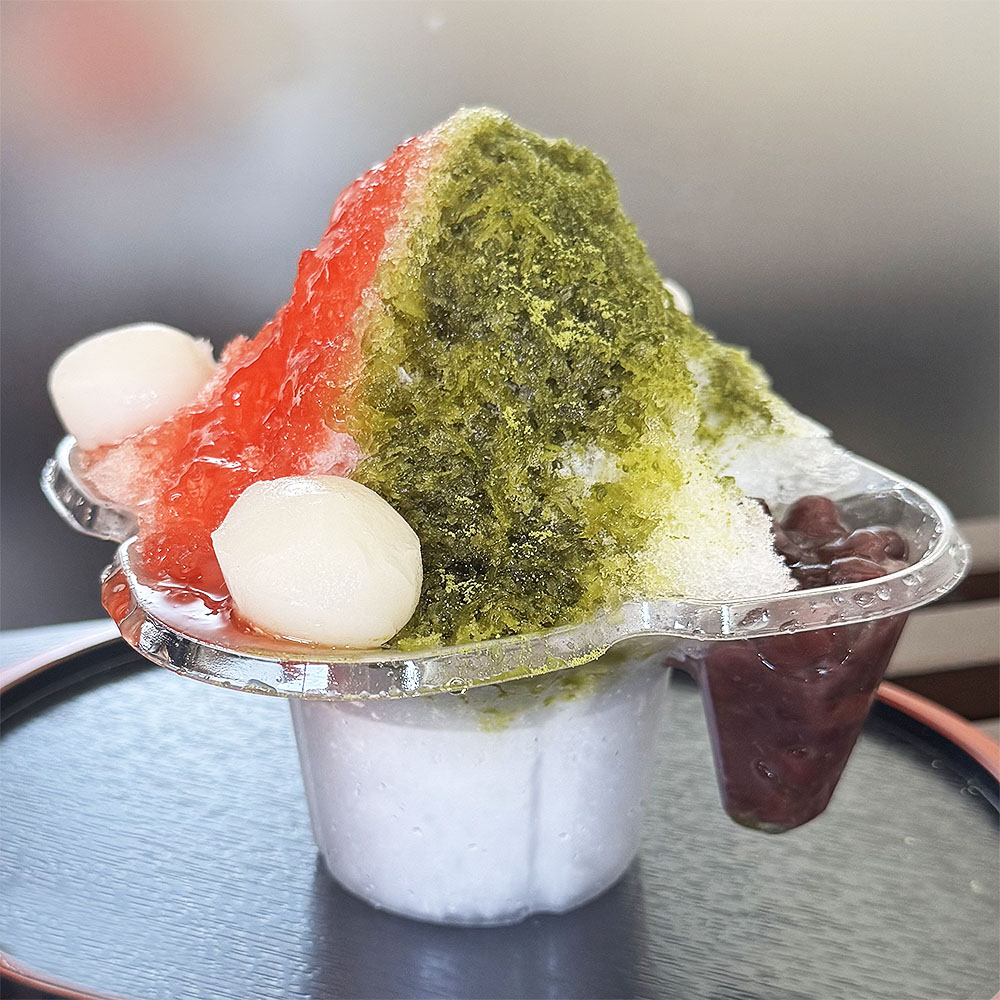 香り高いお茶のシロップがふわふわの氷に染みわたり、丁寧に炊きあげた上品な甘さの大納言小豆と相性抜群。さらに、手作り団子のもちもち食感がアクセントに。